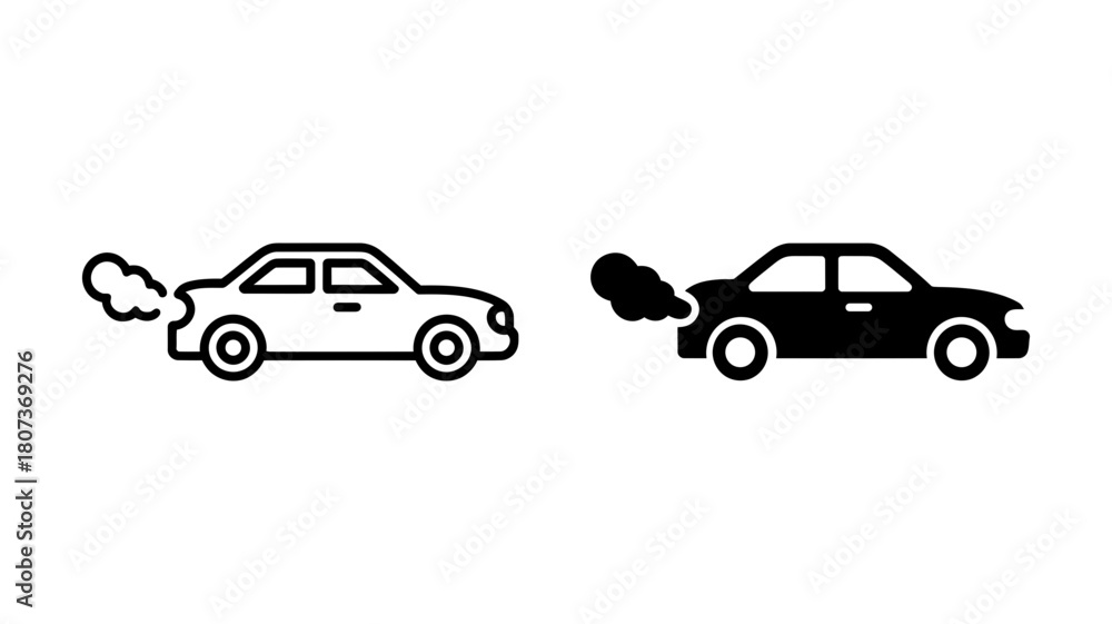 Car exhaust fumes icon set illustrating air pollution and environmental impact from vehicle emissions, outline and solid black styles. #1807369276