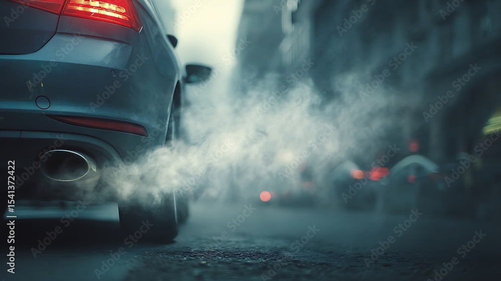Car exhaust pipe releases thick white smoke. Vehicle on city street pollutes urban environment with harmful emissions. Air pollution, smog concept, ecology. . #1541372422