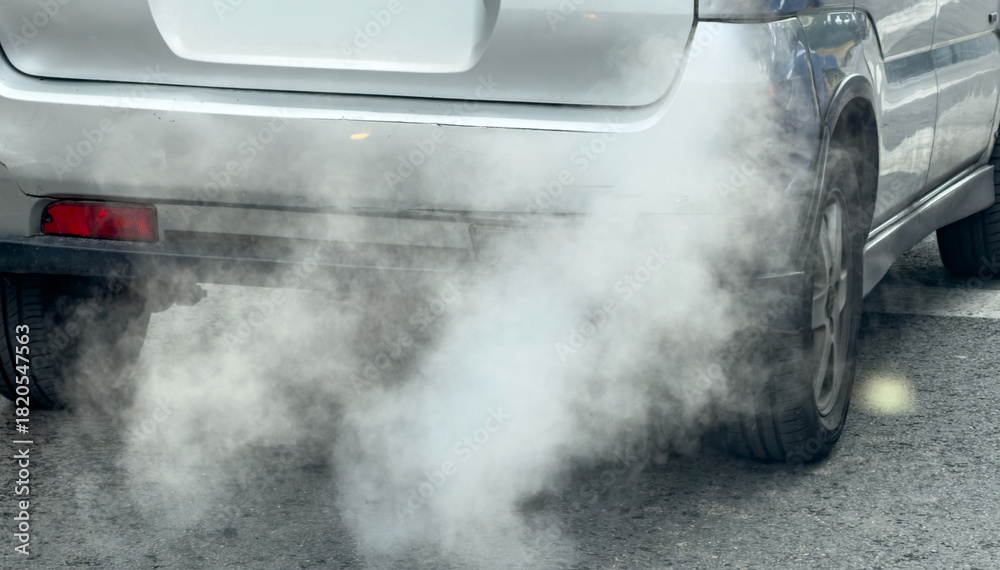 Car exhaust smoke polluting air upon urban street, closeup view of rear bumper and tires within daylight #1820547563
