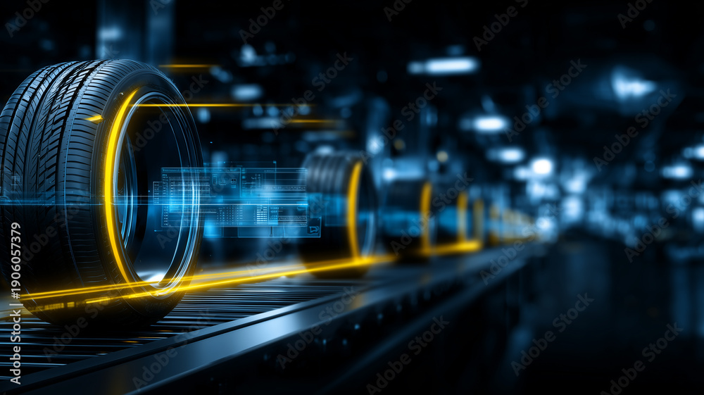 Car tires moving on an automated production line with digital overlay, representing smart factory logistics and automotive manufacturing. #1906057379