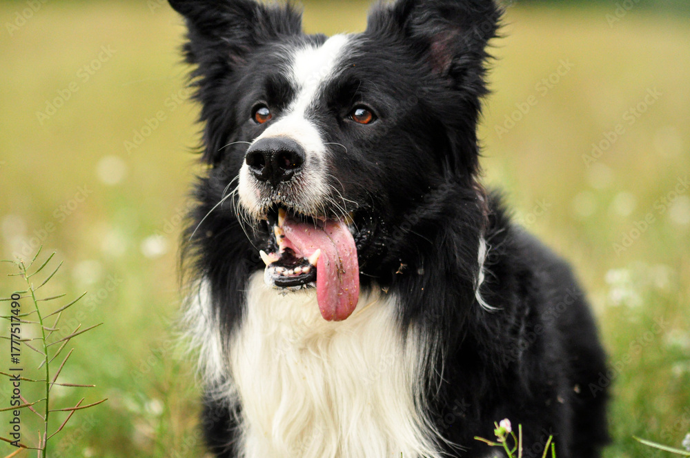 Cara de border collie feliz con la lengua fuera en la naturaleza #1777517490