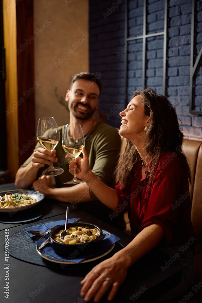 Carefree couple having fun while drinking wine and eating in restaurant. #1697053438