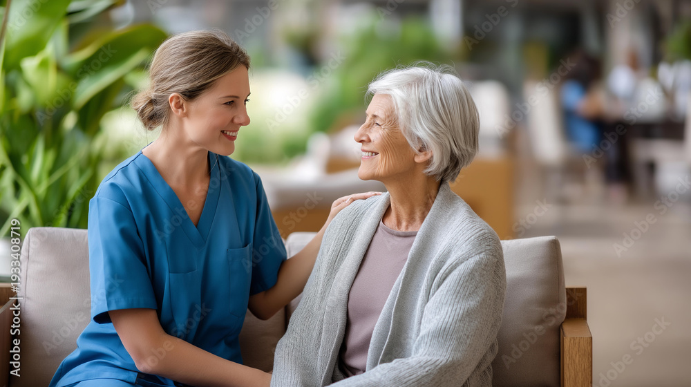 Caregiver attentively sitting with a senior woman in a nursing home lounge, professional elder care, retirement home caregiver, senior resident support, nursing home daily care, #1933408719