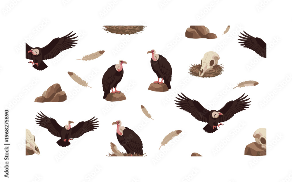 carrion birds patterns seamless pattern, repeating pattern, surface design, textile print, modern illustration of vultures flying, perched, desert rocks, #1968275890