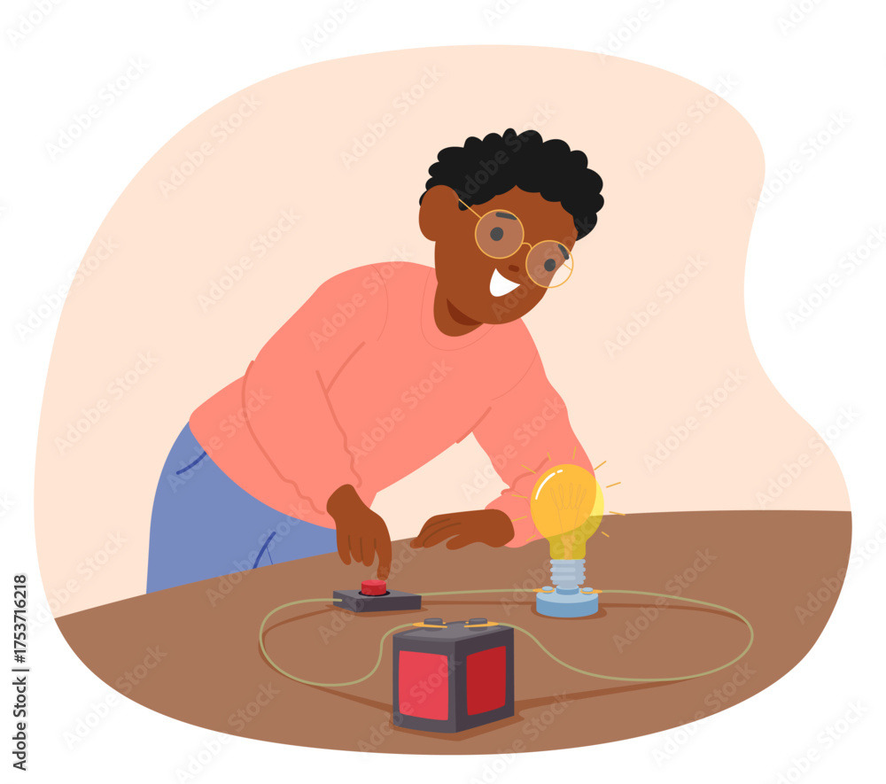 Cartoon schoolboy student performing hands-on electric circuit experiment in classroom scene #1753716218