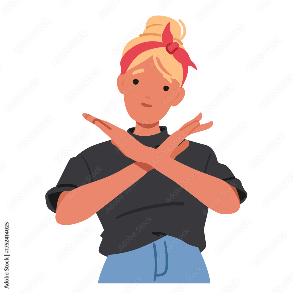 Cartoon young woman cartoon character with stop hand gesture showcasing limit and negative opinion #1752414025
