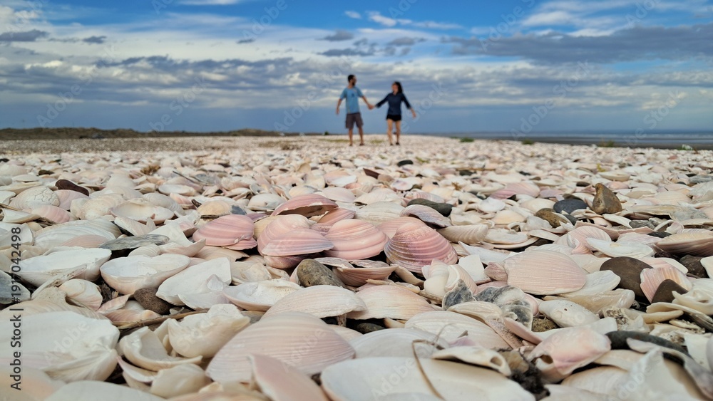 Casal caminhando em praia cheia de conchinhas em San Antonio Este. Argentina #1917042498