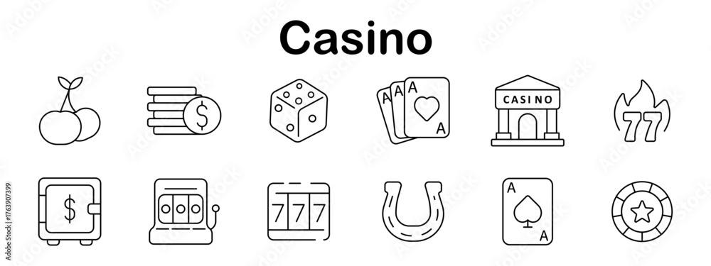Casino set icon. Cherries, coin stack, dice, cards, casino building, fire 77, safe, slot machines, horseshoe, poker chip drawn in clean gambling theme line icons. #1763907399