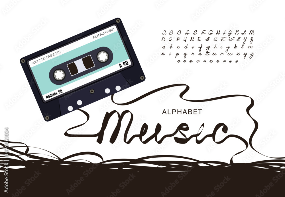 Cassette Tape Alphabet - Retro Font Made from Magnetic Audio Tape, Creative One-Line Letters and Numbers in 80s Style. #1474021034
