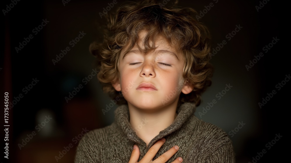 Caucasian boy a hand touch on his chest take deep breath try to calm relax himself #1737545050