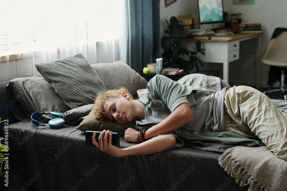 Caucasian teenage boy lying on bed holding smartphone close to face, staring at screen with tired expression, demonstrating signs of gadget addiction in bedroom setting #1689660922
