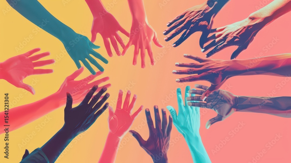 Celebrating world humanist day with unity and diversity in vibrant colors. Horizontal banner. Copy space. Free space for text. Human hands on a yellow background #1541221304