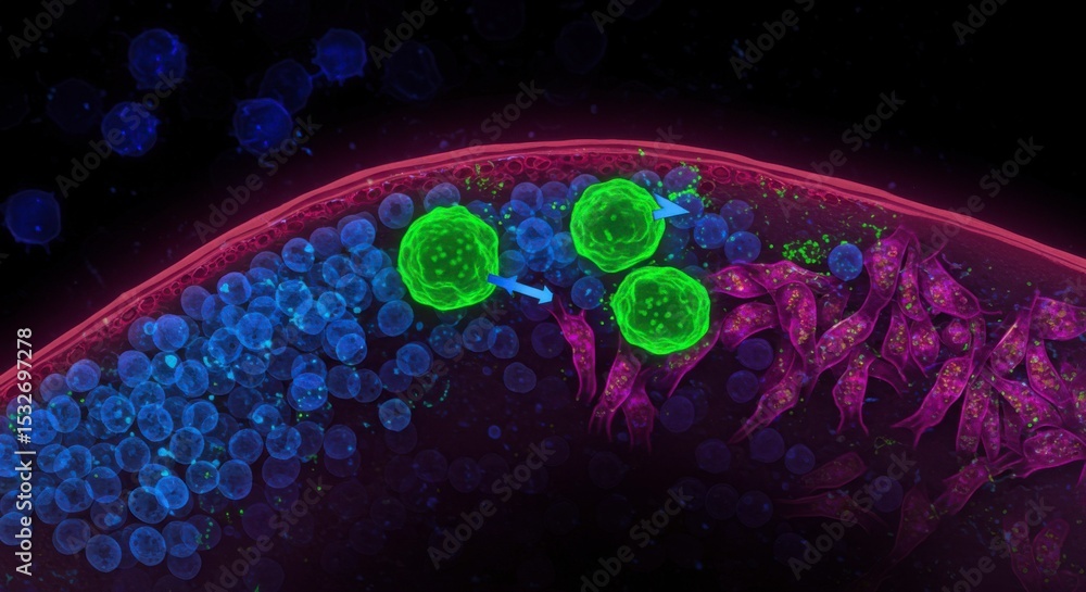 Cellular interaction visualized by fluorescence microscopy. Immune cells interacting with a tissue layer #1532697278