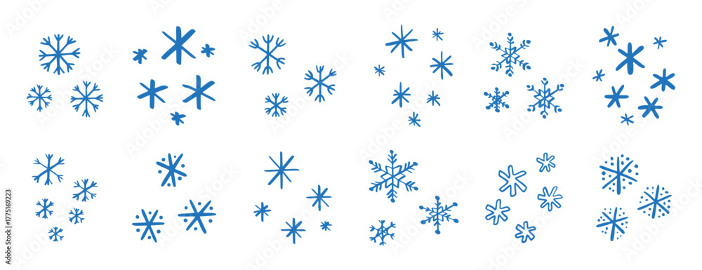chalk pencil drawing blue snowflakes set. Snowflake doodle hand drawn cute style elements. Winter or Christmas concept. #1775169223