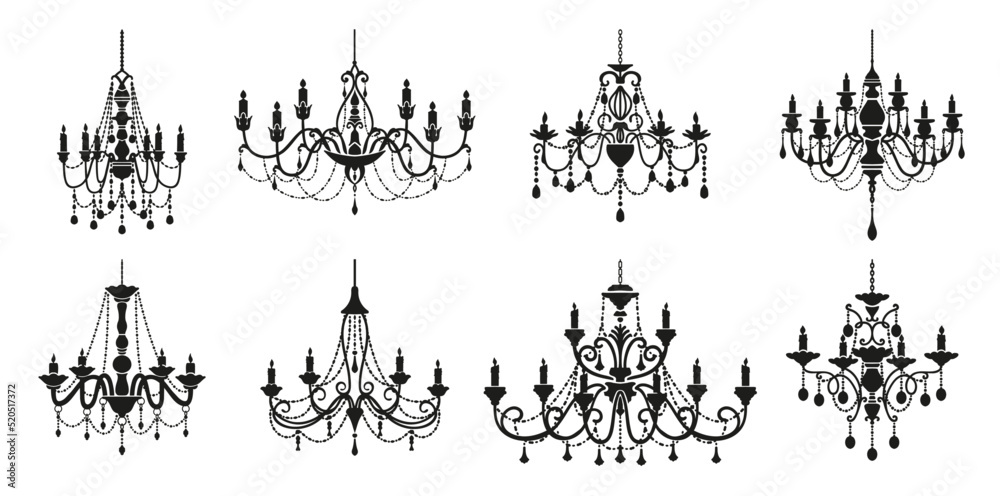 Chandelier silhouettes, crystal lamp lights or baroque candelabra with candlesticks, vector icons. Vintage chandelier lamps or royal lampshades with candles and crystal pendants in black silhouette #520517372