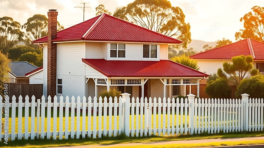 Charming single-story suburban house with a red roof and white picket fence under sunny skies. #1765695160