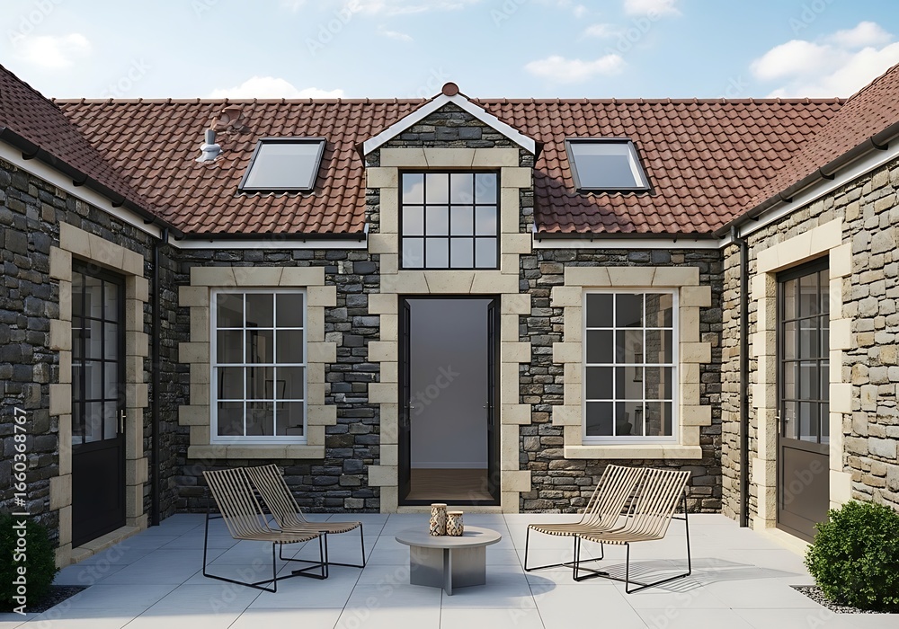 Charming stone courtyard home featuring a new paved patio area with contemporary outdoor seating and traditional architecture under a bright sky. #1660368767