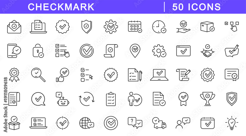 Checkmark icon set. Approval icons in line style. Editable web icons for agreement, vote, confirmation, choise, validation, completed tasks and verified status. Vector illustration. #1911809618