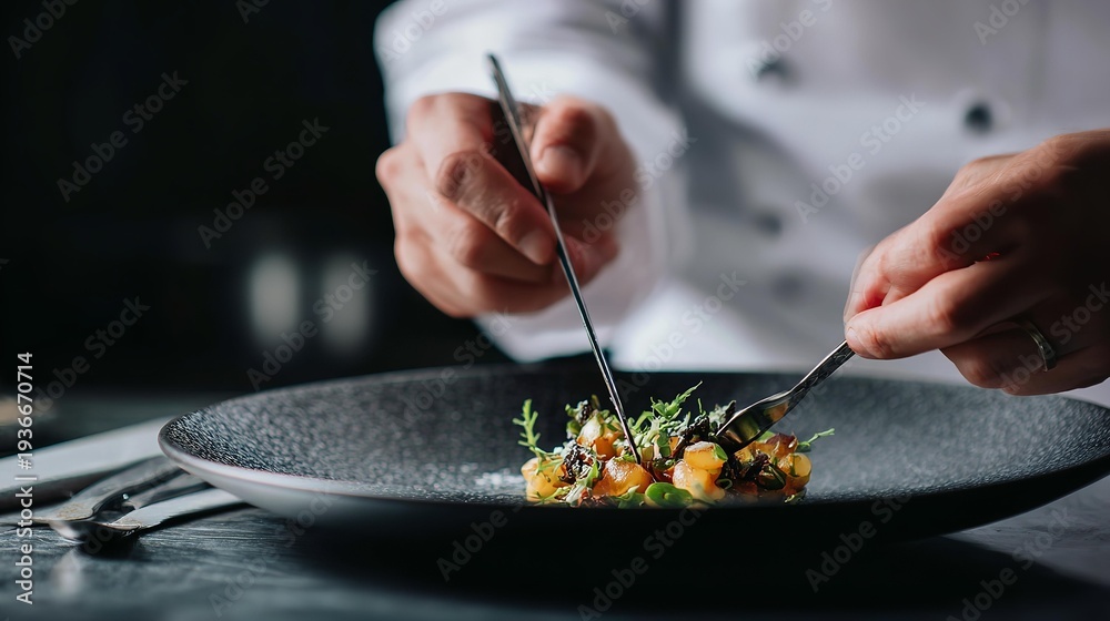 Chef's hands finishing up decoration of a dish #1936670714