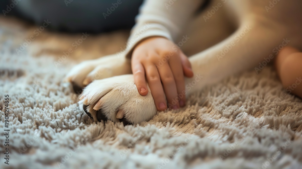 Child gently holds dog's paw on soft carpet. #1904274855