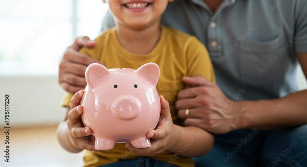 child holding pink piggy bank with parent guidance and support in a bright living room #1755117230