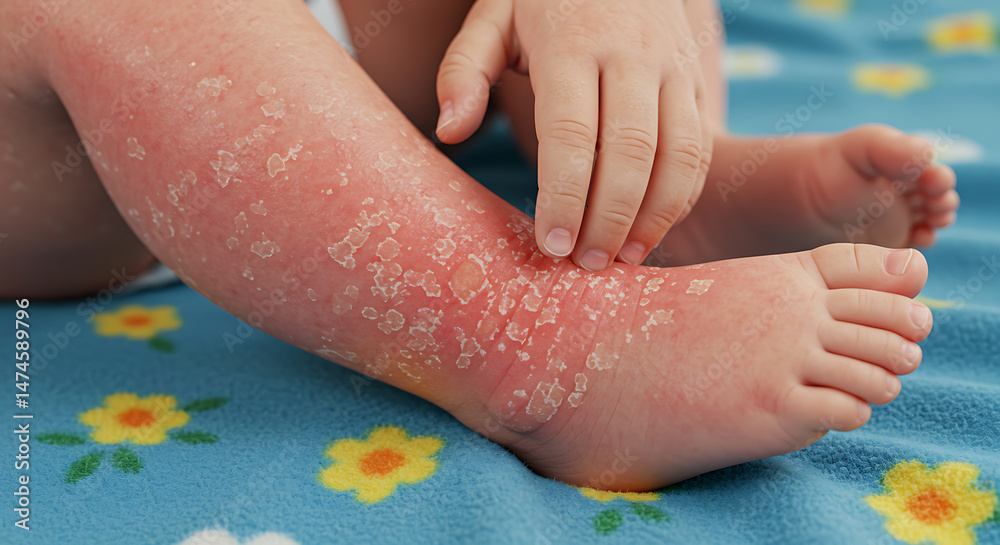 Child's leg with severe skin peeling and redness, illustrating dermatological conditions, ideal for medical articles and health websites #1474589796
