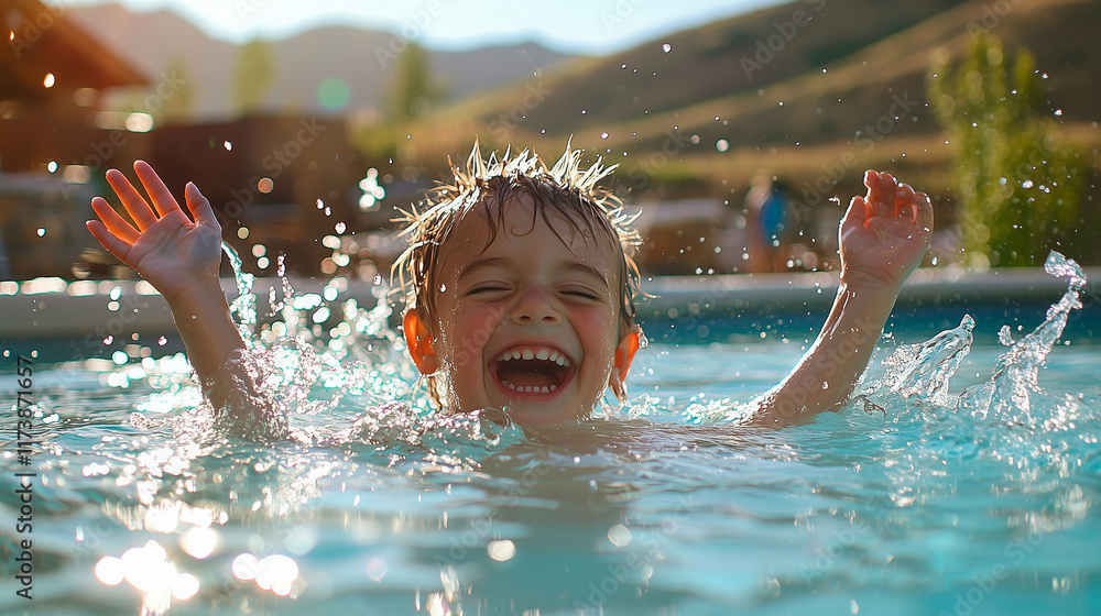 Child Splashing in Shallow Thermal Pool on Sunny Day #1173871657