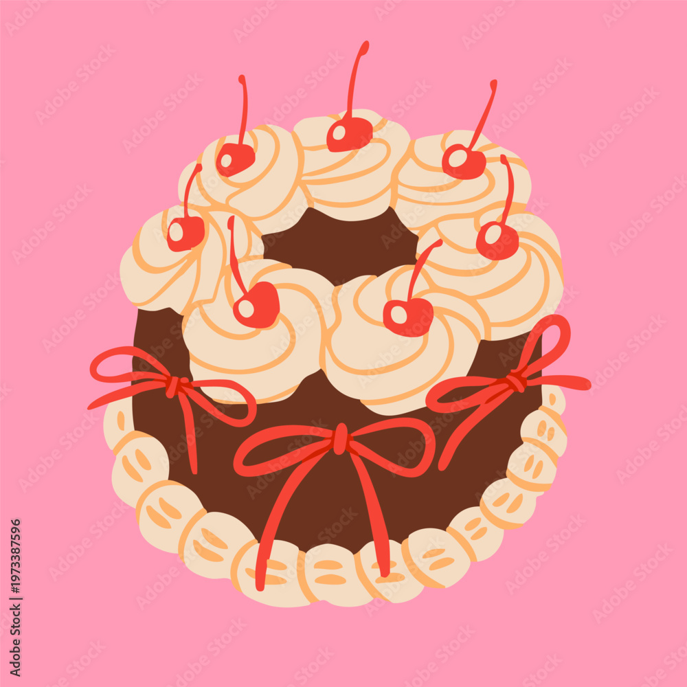 Chocolate Cake with cherry, cream, ribbon bows. Sweet tasty food. Hand drawn trendy Vector illustration. Isolated design element. Party, wedding, anniversary, celebration, birthday concept #1973387596