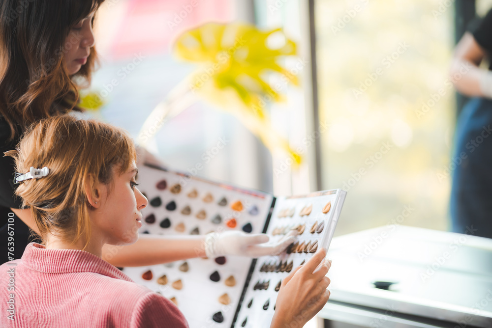 Choice of Hue: Client Ponders Hair Dye Options at Salon for the Perfect Color Transformation #763967100