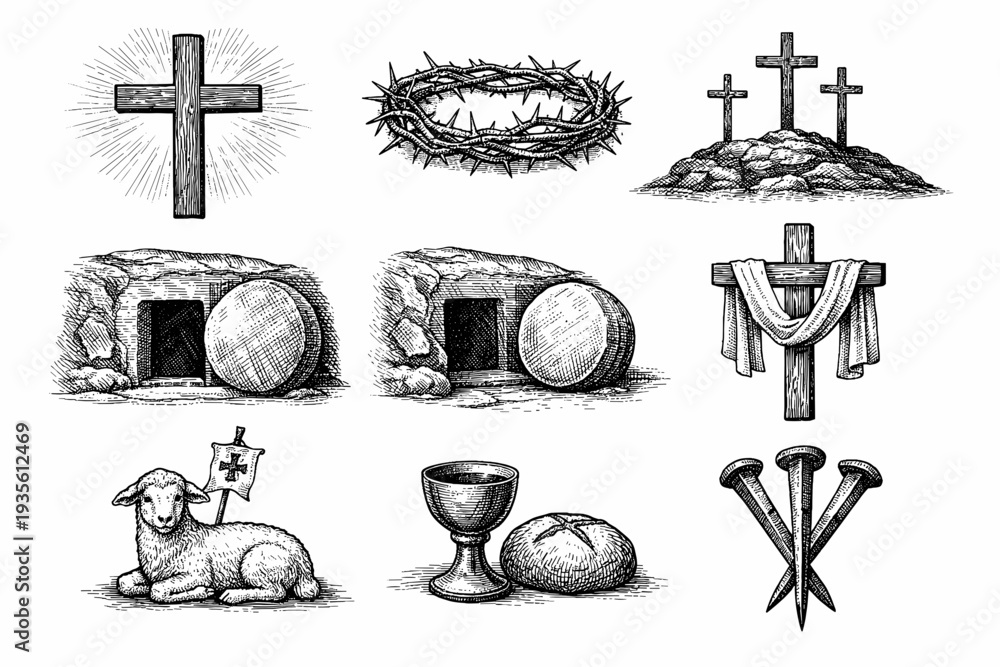 Christian Easter Vintage Engraving Icon Set with Cross, Crown of Thorns, Empty Tomb, Lamb and Communion Symbols #1935612469