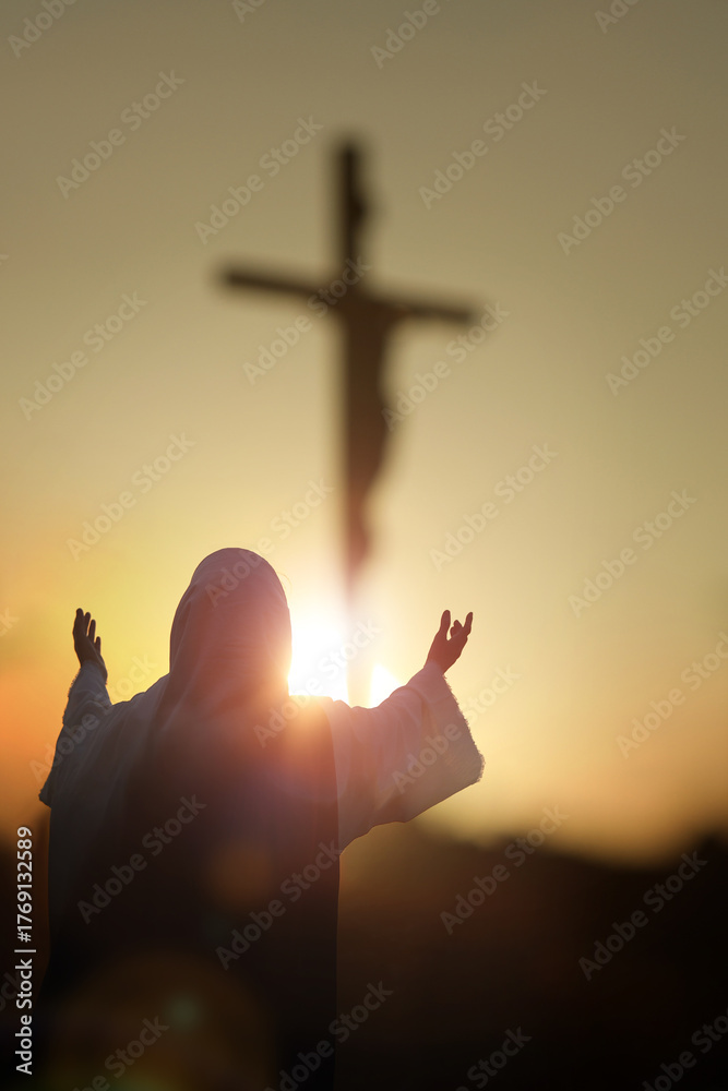 Christian silhouettes raising their hands toward the cross of Jesus Christ, praying in sorrow, Holy Week background #1769132589