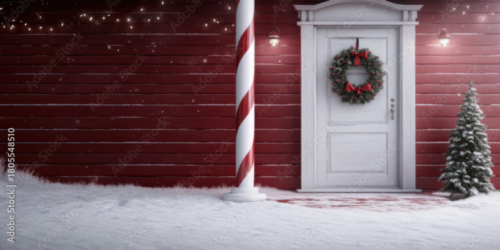 Christmas backdrop with a front porch with red and white striped candy cane columns, wreath on door, snow and Christmas lights #1805548510