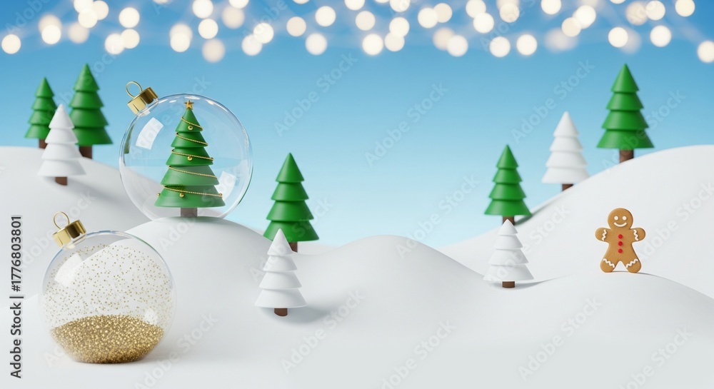Christmas landscape full of snow with fir trees and Christmas balls #1776803801