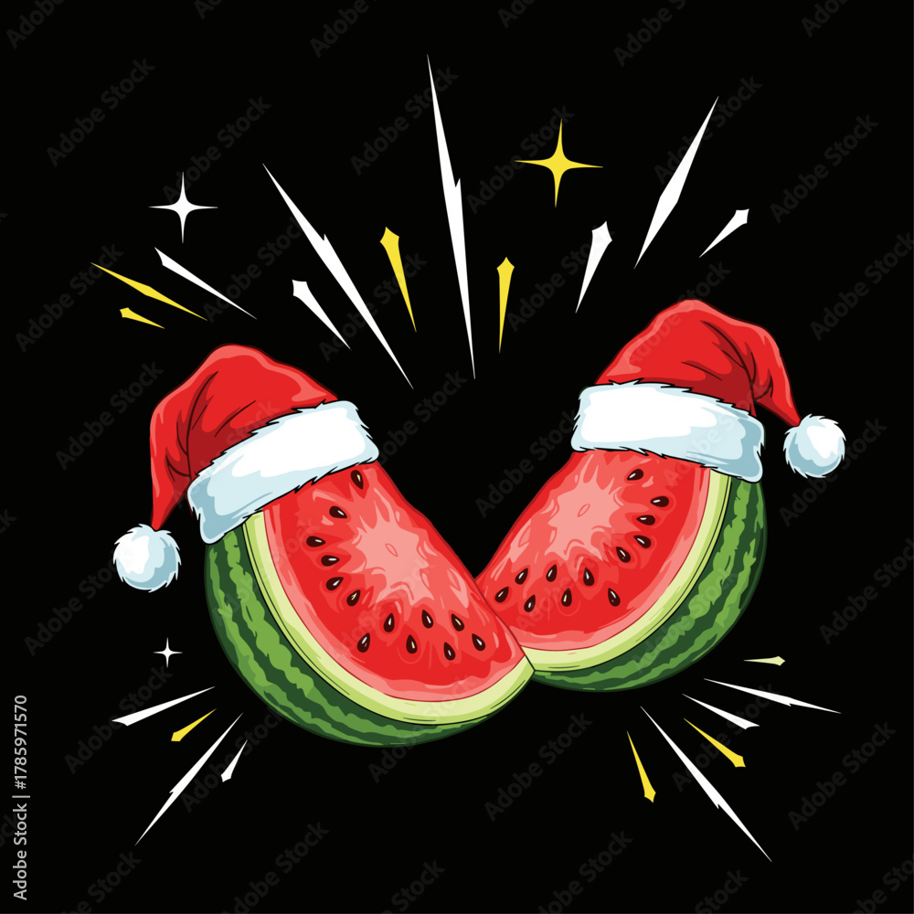 Christmas Watermelon Halves with Santa Hats and Holiday Sparks #1785971570