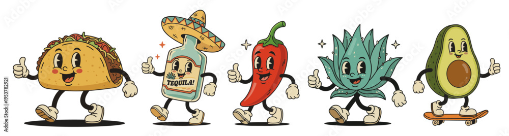 Cinco de Mayo vintage mascot characters set featuring Mexican food and culture icons in retro cartoon style #1953782921