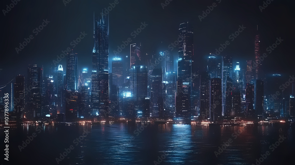 Cinematic cityscape view of a massive futuristic cyberpunk city at night crowded with glowing tall buildings. Cinematic. Illustration #1077896335