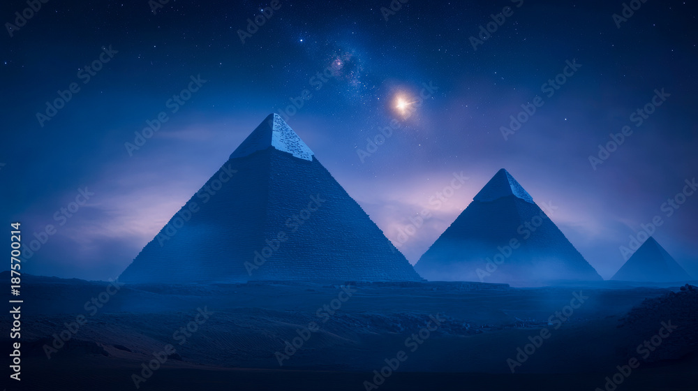 Cinematic scene of the Giza Plateau at night, with the pyramids silhouetted against the Orion’s Belt that shines above #1875700214