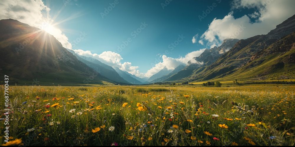 Cinematic view of wildflower-filled valley with towering mountains and drifting white clouds for documentary stills, tourism promotion, motivational poster, mindfulness content, nature photography #1687700437