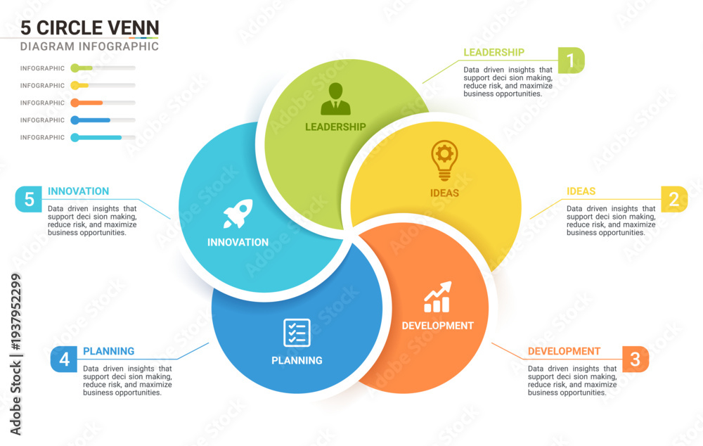 5 Circle Venn diagram infographic template. Interlocking Mobius strip loops with icons for business presentation. #1937952299