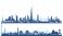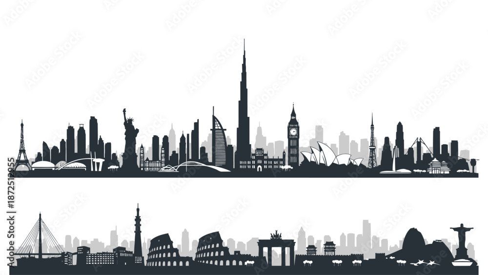 City skylines with iconic landmarks from around the world in silhouette against a white background #1872512955