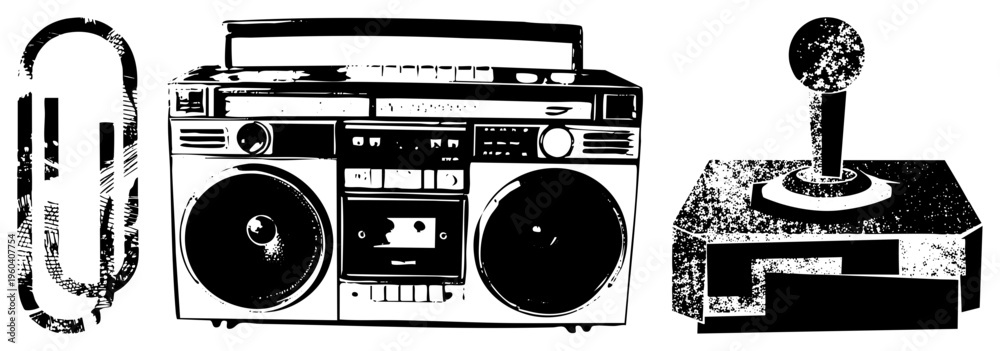 Classic boombox with cassette deck, retro gaming joystick, and cassette tape player, vector graphic with halftone texture, 80s nostalgia, isolated tech. #1960407754
