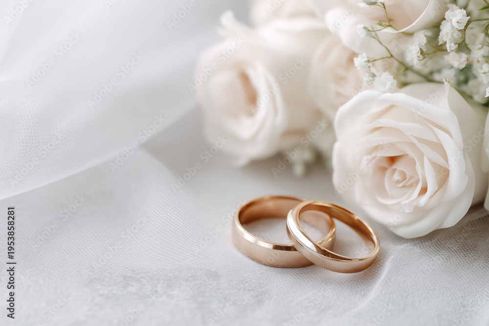 Classic simple gold wedding rings with white roses and flowers, bride veil background with copy space for text, elegant wedding invitation #1953858281