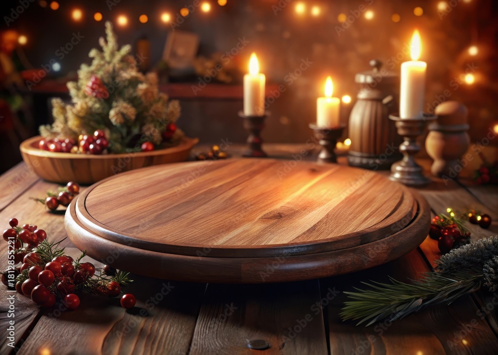 Classic wooden round board centerpiece adorns a festive holiday table as a decorative piece #1812855221