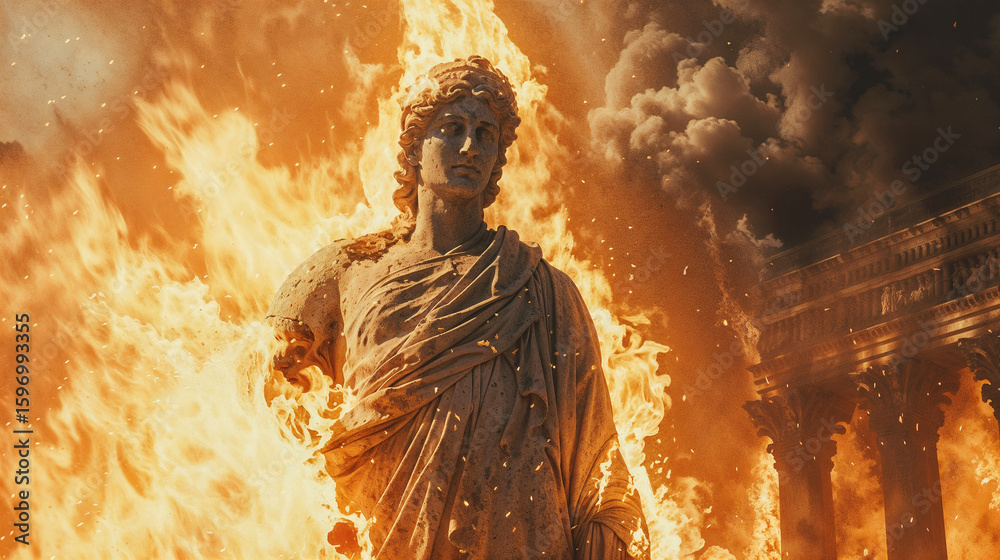 Classical Roman statue engulfed in devastating flames symbolizes fall of ancient empire and destruction of timeless civilization heritage under fiery assault. #1596993355