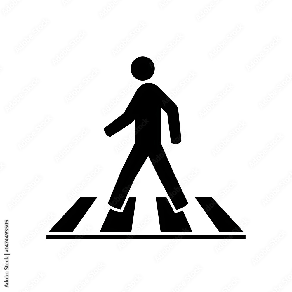 Clear black and white icon depicting a person carefully walking on a zebra crossing. A universal symbol for road safety and pedestrian awareness. #1474493505