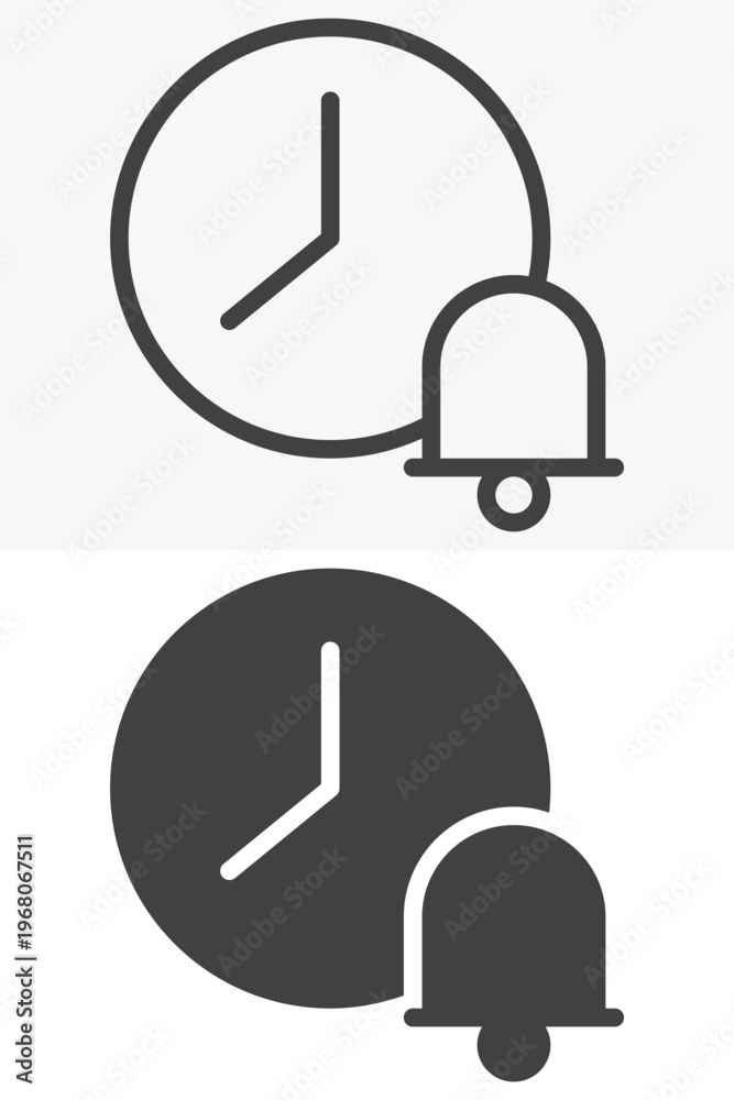 Clock Bell Notification icon in line, outline and solid style. Editable stroke vector sign and symbol set for time use, with clock bell notification icon in simple versions. #1968067511