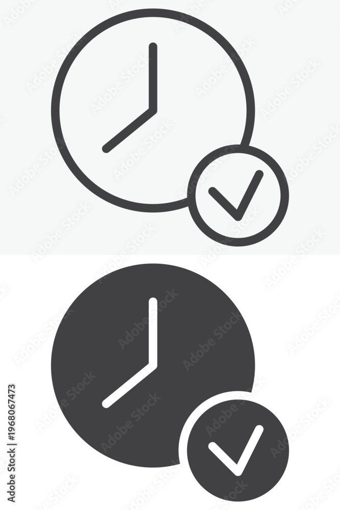 Clock Check Mark icon in line, outline and solid style. Editable stroke vector sign and symbol set for time use, with clock check mark icon in simple versions. #1968067473