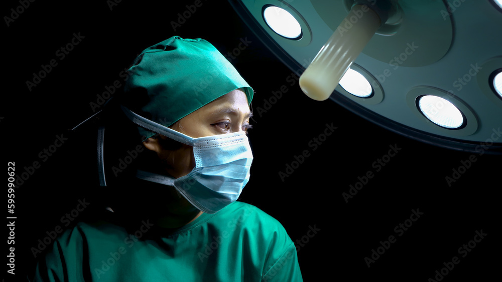 Close-up face eyes doctor in operating room has determined look in eyes, ready perform surgery for patients are in operating room doctor wears hat collect hair cloth scraps for cleanliness safety. #595990622