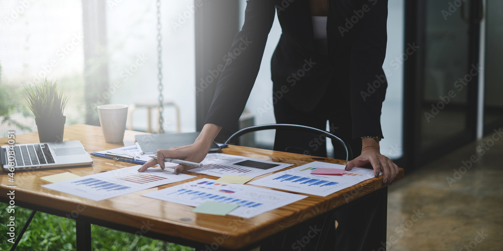Close up Hand of Business woman working to analyze technical price graph and indicator #468084051