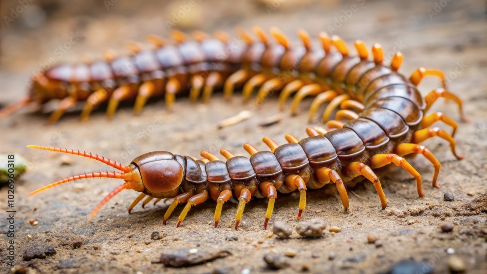 Close-up image of a centipede crawling on the ground, centipede, insect, creepy, crawly, legs, nature, wildlife, close-up, macro #1026960318